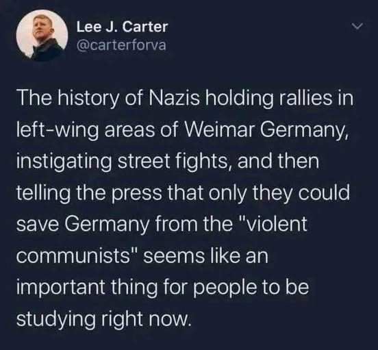 The history of Nazis holding rallies in left-wing areas of Weimar Germany, instigating street fights, and then telling the press that only they could save Germany from the “violent communists” seems like an important thing for people to be studying right now.