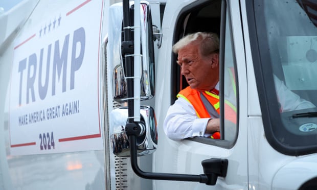 The Guardian, 31 Oct 2024: Trump stages garbage truck stunt in bid to turn tables over Puerto Rico backlash, subtitled “Republican nominee in high-vis vest says ‘250 million Americans are not garbage’ as he capitalises on Biden gaffe”