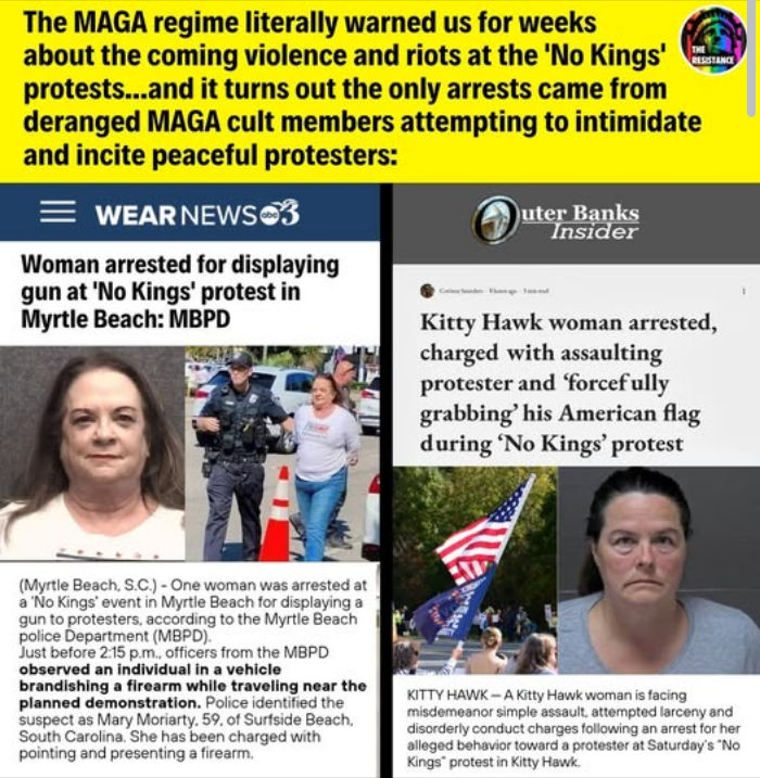 These are arrests of women threatening the No King demonstrators. Perhaps they believed the stories that the No Kings demonstrators were violent terrorists.