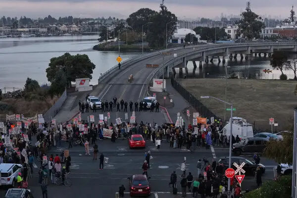 This article is actually the end of the story. When I turned on the TV news about 6:30am I saw live coverage of protesters trying to block federal vehicles from driving from Oakland over to Coast Guard Island, the small island between the mainland of Oakland and the island of Alameda, as labeled on this map.