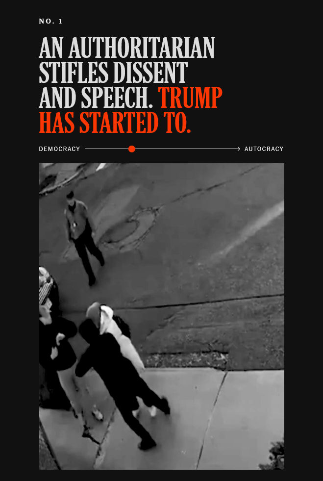 Today comes an analogous, much more elaborate piece at NYT, designed to be scrolled through, listing 12 “markers of democratic erosion,” with scales showing how far along we are along each one, moving away from democracy.