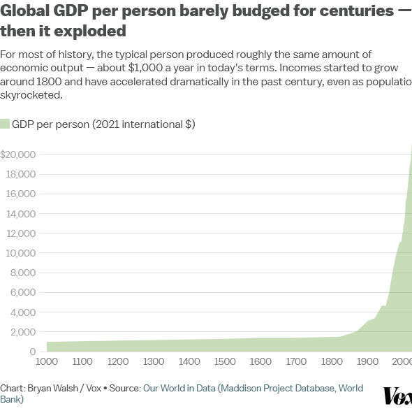 Anthropologist George Foster argued that many peasant communities were organized around an “image of limited good”: land, wealth, status, even good luck were assumed to exist in fixed amounts, so any gain for one person was understood as a loss for someone else. The last two centuries of industrialization and technological innovation broke that logic; for the first time in history, large societies could become much richer over time, and most people’s material standard of living could rise together.