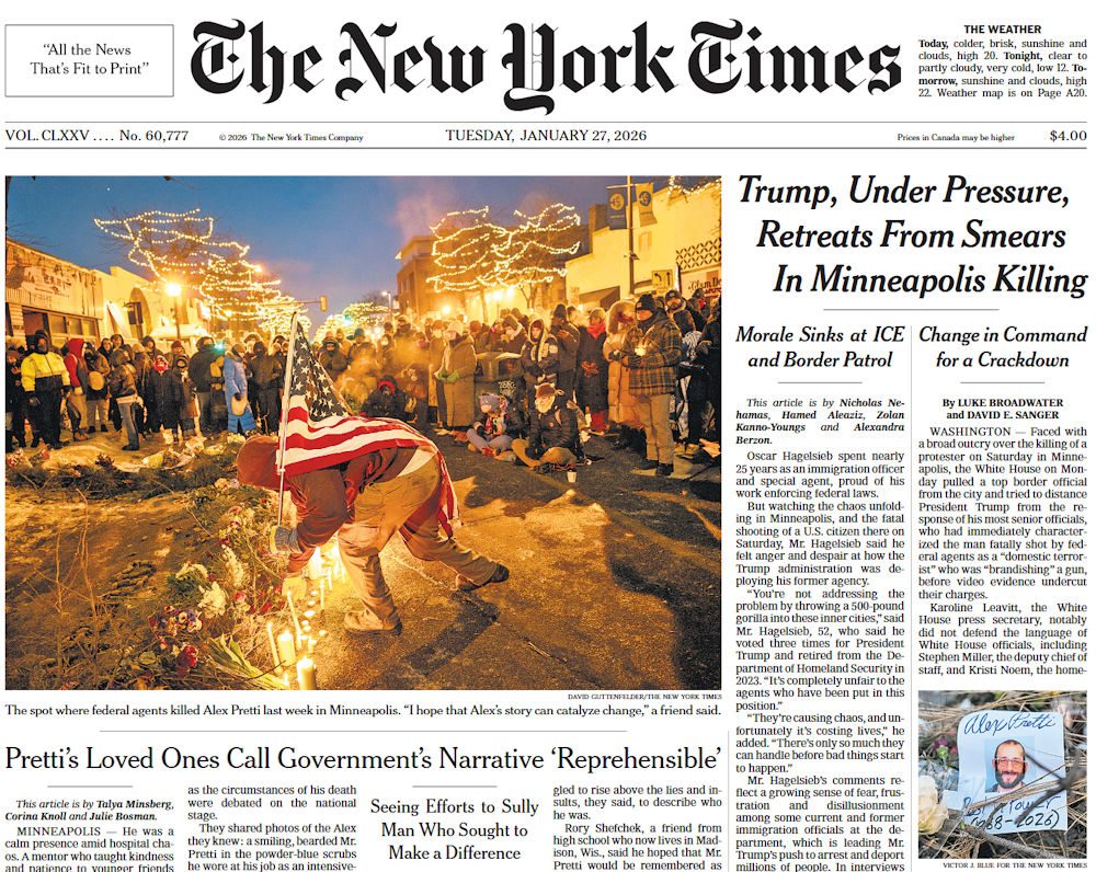 NY Times, 27 Jan 2026: Crackdown Chief to Leave Minneapolis as White House Distances Trump From Uproar, subtitled “The departure of Gregory Bovino, whose tactics have drawn sharp criticism, is an indication that officials see Alex Pretti’s killing as a political threat to President Trump.”