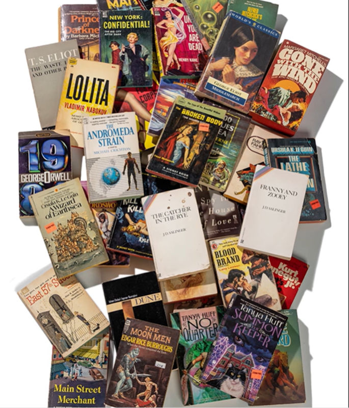 (Aside: I own, or perhaps once owned, the editions shown in this photo collage of A WIZARD OF EARTHSEA, THE ANDROMEDA STRAIN, DUNE, and CAT’S CRADLE (the red one in the back at bottom right).)