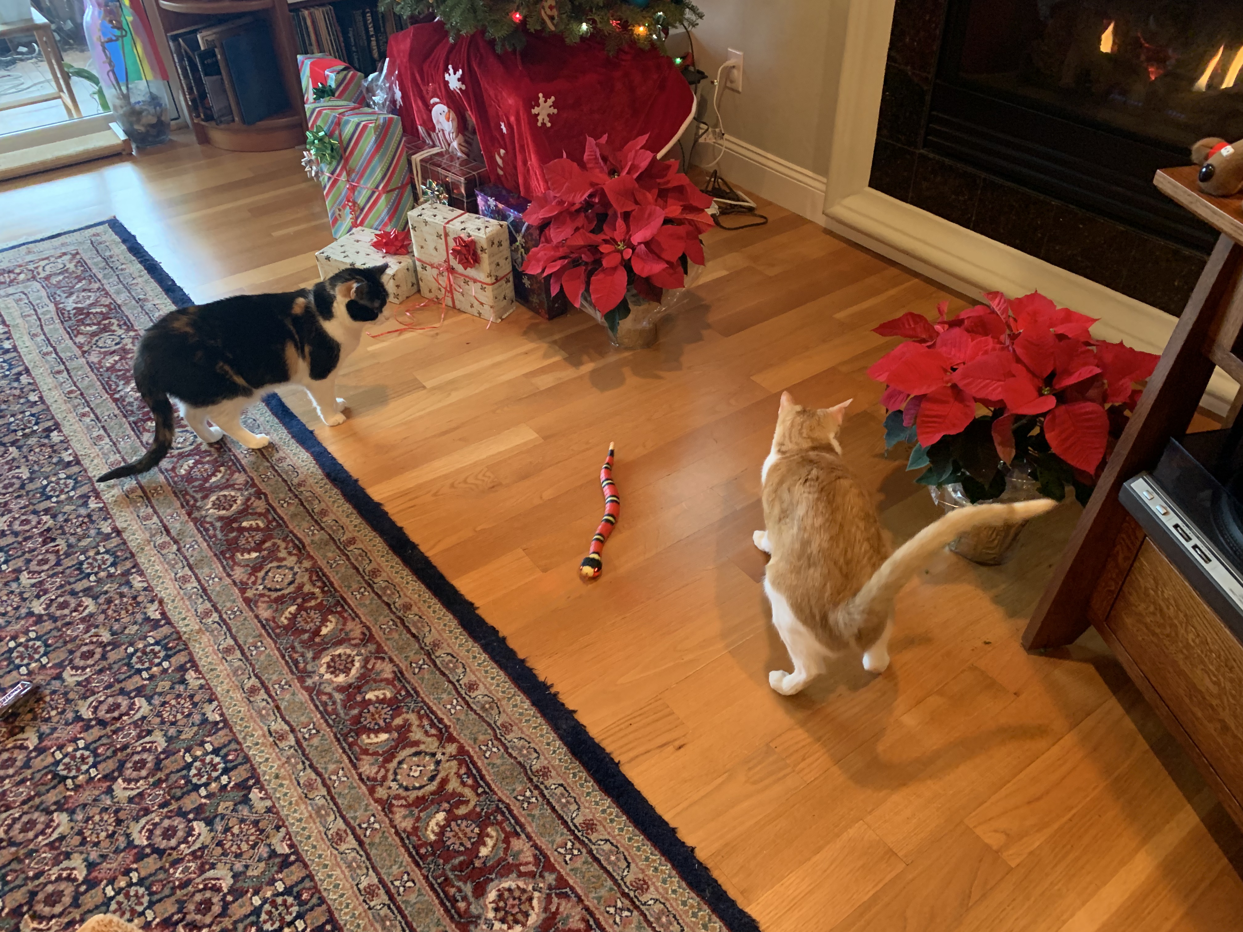 Just a quick post for today. The photo shows an electronic snake toy I bought for our cats. (From ads I saw on Facebook.) It goes back and forth, reacts to objects in front them, pauses every once in a while waiting for a cat to paw at it, then starts up again.